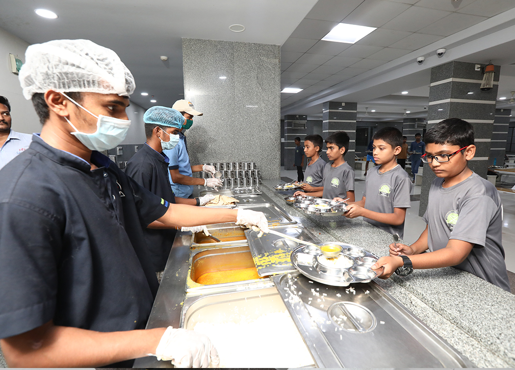 The School Cafeteria is a bright, well-ventilated, hygienic space with a colourful lively ambience. The cafeteria serves healthy, nutritious vegetarian snacks and meals. The cafeteria does not serve any junk food.